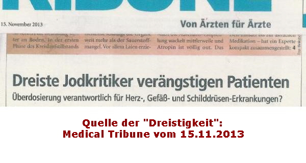 Nach dem Verständnis der Verfasser der Beschwerde soll es dem ZDF nicht erlaubt sein, die von Bundesregierung sowie AKJ, DGE & Co. geförderte kollektive Jod-Prophylaxe kritisch zu hinterfragen, ohne damit seinen Bildungsauftrag zu verletzen. Unter Bildungsauftrag wird in diesem Fall die vorbehaltlose Verbreitung der von AKJ, DGE & Co., Bundesregierung und anderen staatlichen (z. B. BfR, RKI) wie auch nichtstaatlichen Institutionen und “Multiplikatoren” publizierten Informationen, Daten und Empfehlungen verstanden. Den Beschwerdeführern schwebt offenbar eine “gelenkte” Pressefreiheit nach russischem Modell vor. Daher sei dem ZDF dafür gedankt, dieses explosive Thema (...vergl. ZDFneo von 04/2012) erneut “wertneutral” mit der gebotenen Distanz aufgegriffen und mit eigenen Recherchen sowie aufwändigen Analysen eine zum Nachdenken anregende, eindrucksvolle Dokumentation geschaffen zu haben. Für die in Sachen Jodprophylaxe bisher weitgehend blinden Medien könnte diese Sendung ein Anreiz sein, endlich eine Korrektur des in 2009 auch von Medienwissenschaftlern diagnostizierten Tunnelblicks vorzunehmen: Der Schildrüsenguide verlinkt in seinem Weblog-Kommentar u. a. zu einem sehr interessanten “Dokument” aus dem Archiv des EU.L.E.N.-Spiegel (U. Pollmer): Der Blog Schilddrüsenunterfunktion behandelt unter anderem den beinahe als “Nötigung” charkterisierbaren, mit Jodmangel-Drohungen gegenüber verunsicherten Eltern angereicherten DGE-Blogeintrag (“Fürsorgepflicht”) und kommt zu einem eindeutigen Urteil: *** “Nachbeben” im DGE-Blog: => 14.04.2014 (...Tierfutter) - Kommentarfunktion nicht aktiviert! => 16.04.2014 (...Fürsorgepflicht) - nach 3 Kommentaren deaktiviert! => 04.06.2014 (...Situation D vergleichbar mangelhaft wie USA, daher...) *** Vervielfältigung der DGE-Schelte: => Beispiel ÖGES - Endogramm vom April 2014 unter “Berichte aus den Sektionen: Thyreologie” => Beispiel Hausärzteverband - “Geschürte Jodangst” => Beispiel Medical Tribune - “Doch zu viel Jod in unserem Essen?” => Beispiel WDR5 - "Jod im Essen: Anreicherung ist nicht riskant” Auffällig sind die Ziele der Verlinkungen unter “Mehr zum Thema” - insbesondere der Jodangst-Link zur Fachkommission Diabetes in Bayern (FKDB) ermöglicht erhellende Einblicke: Es sei gewissenhaft recherchiert worden, so die WDR5-Redaktion auf kritische “Anfrage”. Nun, es herrscht Pressefreiheit! 2013 - das Jahr des wiederentdeckten Jodmangels... ...denn - so die dramatisch formulierten Prognosen des “Jodmangel-Kartells” - die gegenwärtigen Kampagnen zur Reduzierung des Salzkonsums führten zwangsläufig zum Jodmangel und somit zu IQ-Verlusten (...Kommentar) und sonstigen schwerwiegenden Defiziten. So überschwemmen AKJ & Co. - gestützt auf einige wenige, angreifbare Studien - nicht nur die Medienlandschaft mit eindringlichen Warnungen vor dem drohenden Jodmangel-Desaster. Zielgruppen dieser, das Verantwortungsbewusstsein herausfordernden Prophezeiungen sind wie immer Schwangere, Eltern, hier insbesondere stillende Mütter und neuerdings (...trotz Risiken) auch die “Senioren”. Flankiert wird der Werbefeldzug von Publikationen - wie hier beispielhaft präsentiert: => Beispiel Spiegel (Print & Online) - eine unverkennbare Kollaboration mit dem AKJ => http://jodmangel.de/presse/jodversorgung-mit-jodsalz-sicher-und-erfolgreich/ => http://www.spiegel.de/spiegel/print/d-123679065.html Ein Abstecher in die Welt des meistfrequentierten Schilddrüsenforums gibt darüber Auskunft, wie derartige Aufklärung wahrgenommen wird: => Beispiele FAZ, Danone - eindeutig identifizierbares “Quellgebiet” => Beispiel Medical Tribune (Printausgabe) - Ärzte für Ärzte: Dem Sprecher des AKJ fehlte leider offenbar die Courage, den “dreisten” Artikel für die Patienten-Allgemeinheit in der Online-Ausgabe freizugeben.